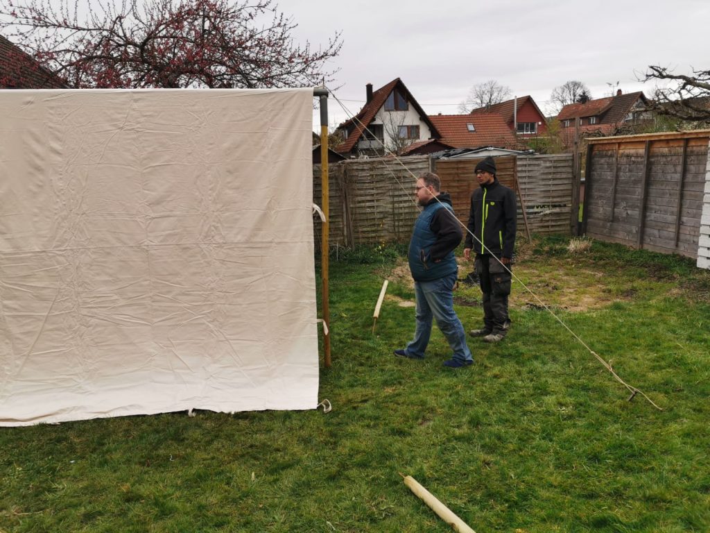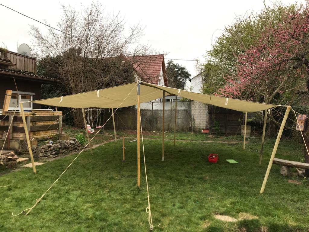 Da ein Mitglied der Gruppe die Kunst des Schweißens beherrscht, waren wir in der Lage die Hülsen-Verbinder für das Gestänge selbst her zustellen. So waren wir nach der Materialbeschaffung bereits am Nachmittag des ersten Tages in der Lage den ersten Probeaufbau des neuen Sonnensegels vorzunehmen. Vielen Dank an alle die Geholfen haben.